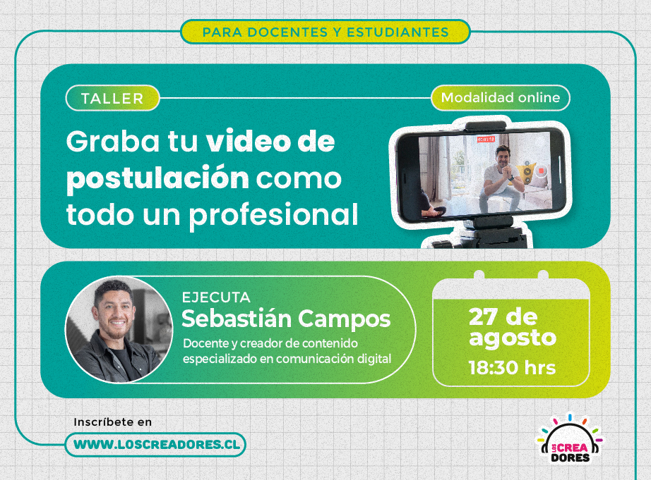 Uno de los puntos claves en la postulación es presentar un video de un minuto en el que nos cuentes la problemática que identificaste, la solución que propones y el impacto que generará. ¡Inscríbete en esta masterclass para que Seba Campos te enseñe los mejores tips para que tu video se vea como el de un pro!